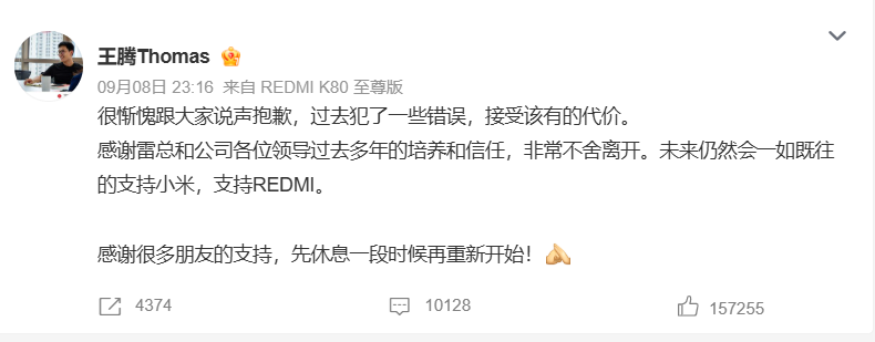 感谢雷总和公司各位领导过去多年的培养和信任,非常不舍离开。未来仍然会一如既往的支持小米,支持REDMI。