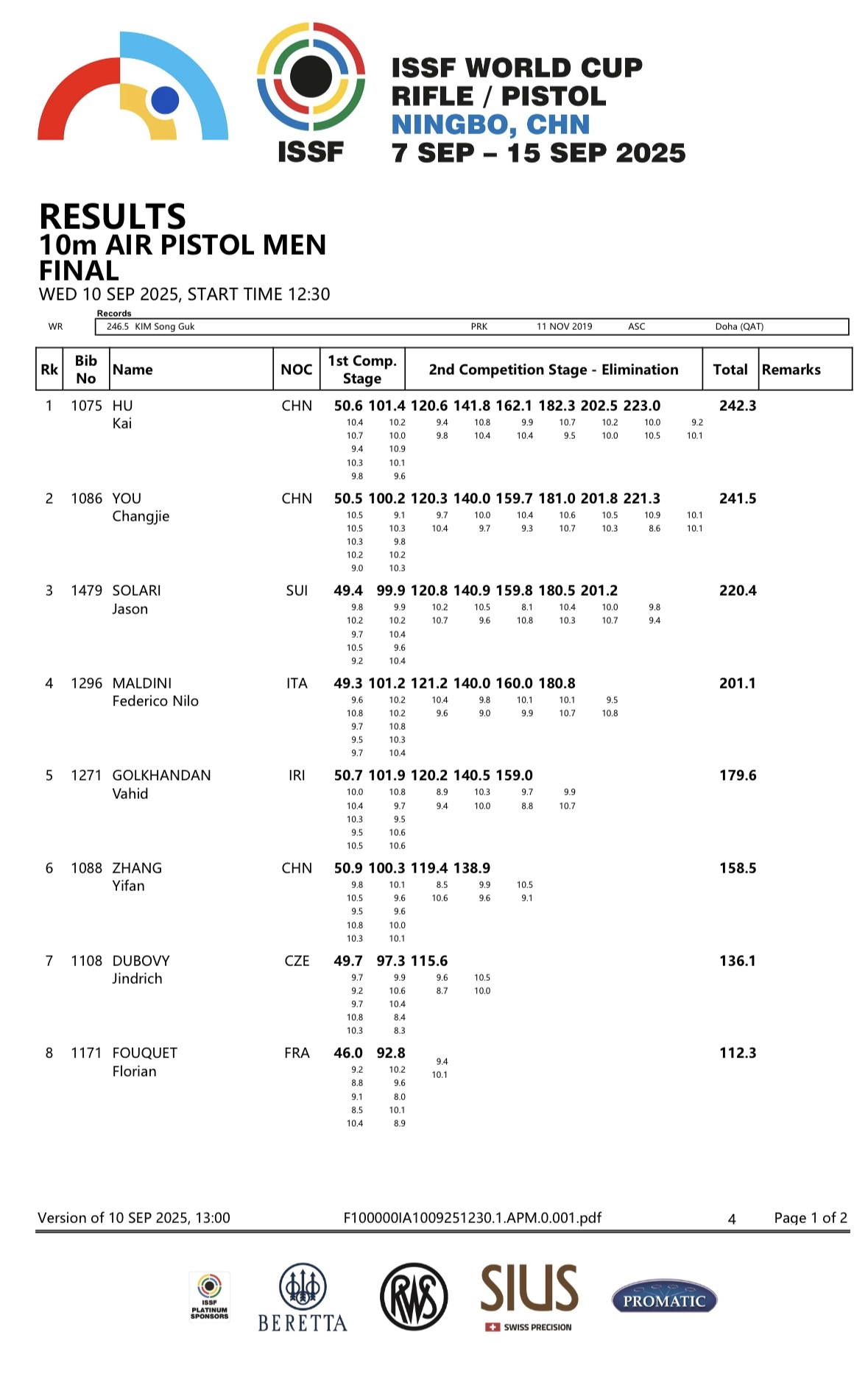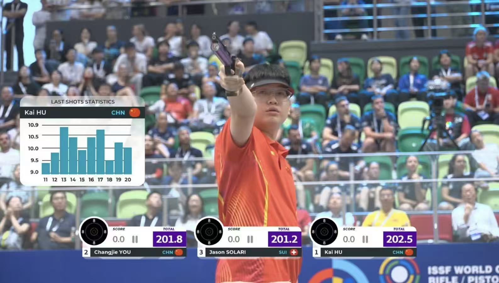 在男子10米气手枪资格赛中,共有3名中国选手脱颖而出晋级决赛。决赛中,胡凯、游昌杰发挥十分稳定,进入到最后的比拼。最后一轮,胡凯首先打出9.2环,出现失误,但他很快调整了状态,在最后一枪打出10.1环的成绩,并凭借此前建立的优势最终夺冠,成绩为242.3环。游昌杰以0.8环之差获得亚军。