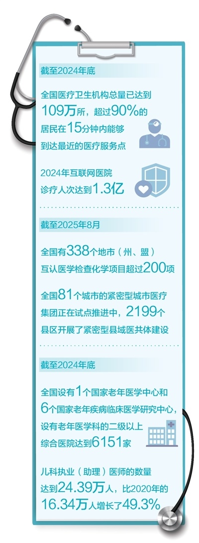 优化医疗卫生资源配置,推动资源和服务更加贴近居民群众。加强国家医学中心、国家区域医疗中心和省级区域医疗中心建设,推动优质医疗资源向中西部、东北地区、省域内人口较多的地市和基层延伸和下沉。截至2024年底,全国医疗卫生机构总量已达到109万所,超过90%的居民在15分钟内能够到达最近的医疗服务点。