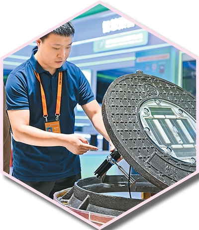 参观者在服贸会上了解诺成新科技公司展出的太阳能智慧井盖,井盖集成光伏充电板、可充电锂电池组、物联网数据采集模块、传感器于一体,可实时监测燃气、自来水、排水管等管网。新华社记者 李 鑫摄