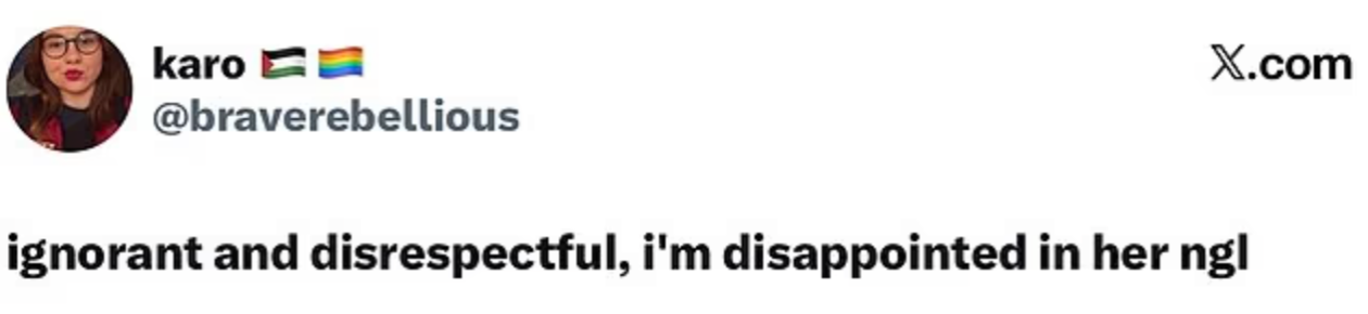 有网友批评说,“无知又没礼貌,说实话我对她感到很失望”。↓