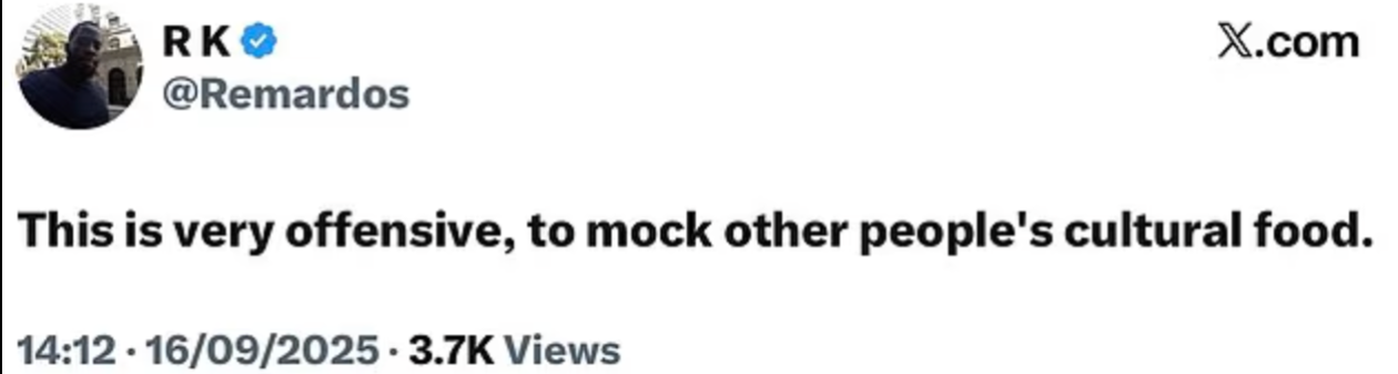 有网友表示,“嘲笑他人的文化美食,这是非常冒犯的行为”。↓