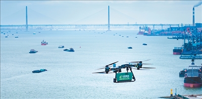 9月18日,在江苏省张家港市冶金园(锦丰镇),一架载有30公斤快递包裹的无人机将货物运往长江上的水上邮政快递综合服务站。
