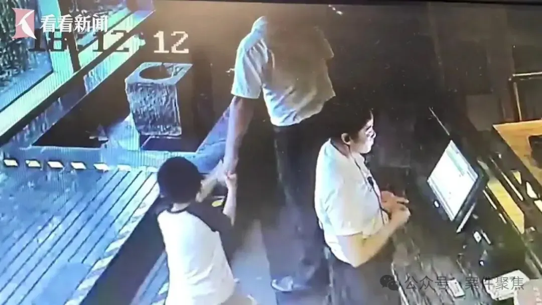 根据事发当时店内监控视频显示,和这对父子一起来吃饭的还有其他朋友,当对方小孩子挣扎想玩时,被家长紧紧攥住。