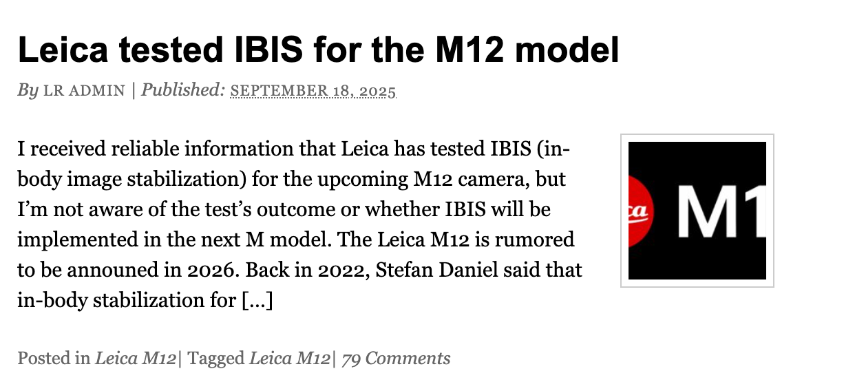 【环球网科技综合报道】9月20日消息,据外媒LeicaRumors报道,在徕卡M11-V即将发布之际,徕卡公司正紧锣密鼓测试新一代M12原型机。该机型最大亮点在于可能首次搭载机身防抖(IBIS)功能,这一技术革新有望彻底改变徕卡M系列在暗光环境下的拍摄体验。