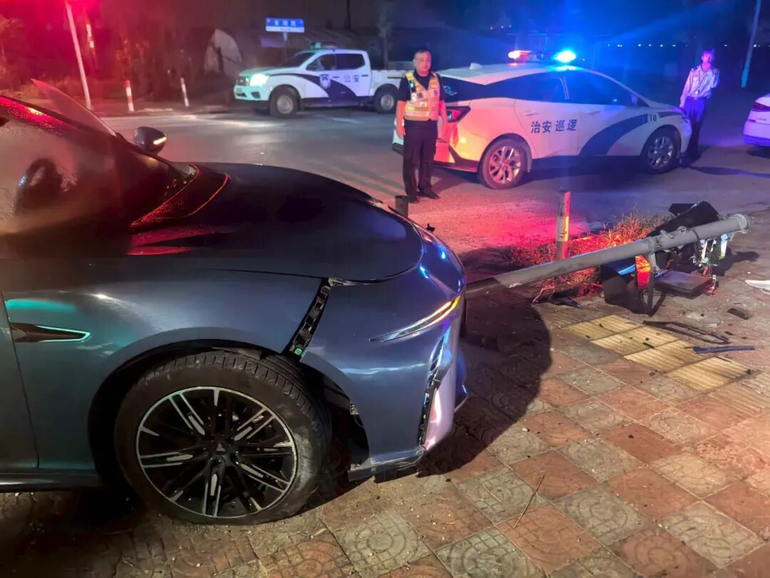 2025年9月5日凌晨3点,浦东公安分局祝桥派出所接到群众报警称,辖区某丁字路口发生一起轿车撞倒红绿灯杆事故。民警沈谊帆迅速赶赴现场,发现有一根红绿灯杆被事故车辆完全撞断,线缆勉强连接、信号灯仍在闪烁。