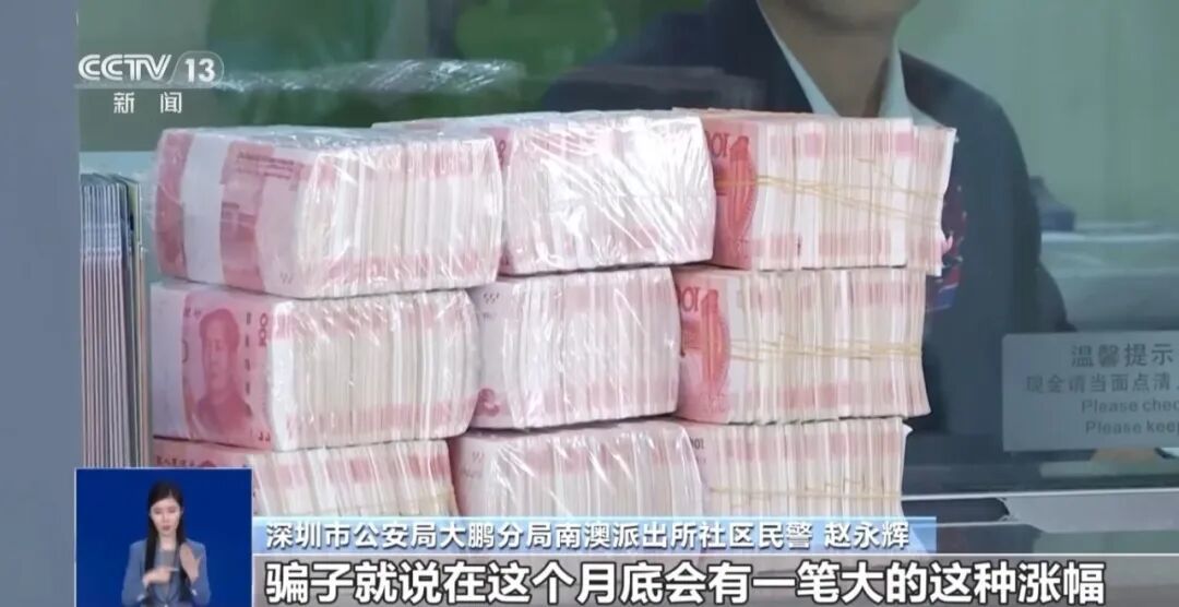 深圳市公安局大鹏分局南澳派出所社区民警 赵永辉:其实他8月初的时候就已经被人洗脑了,开始进入一个炒股的平台和聊天的群里面,骗子就说在这个月底会有一笔大的涨幅,每个人大概要投资50万到100万才会有更多的收益,他就自己跑到银行去想把钱转给对方。