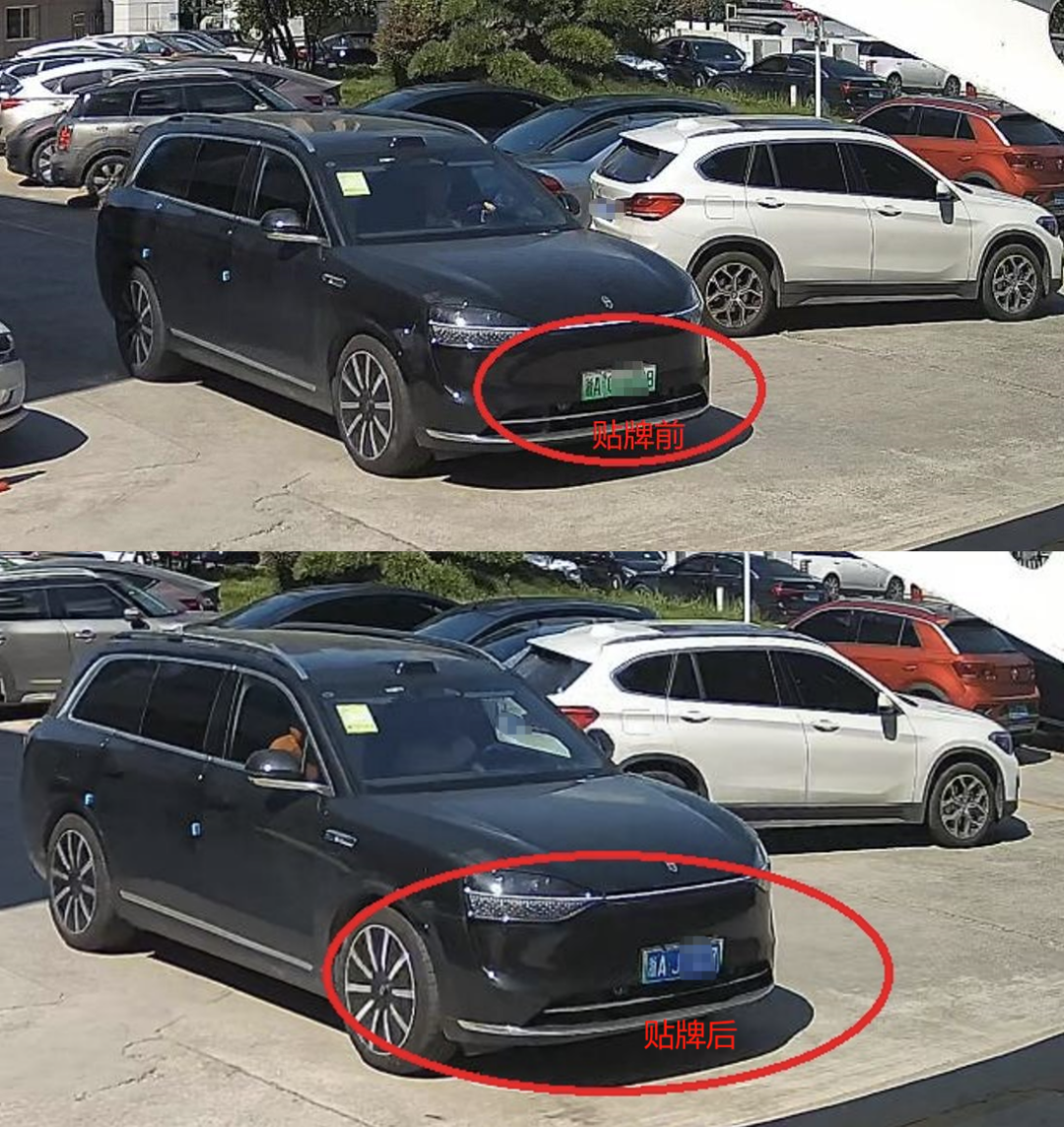车主在驶出停车场前,将一块浙A的蓝色号牌悬挂到车头处。出了停车场,又换回原来的绿色浙A号牌。