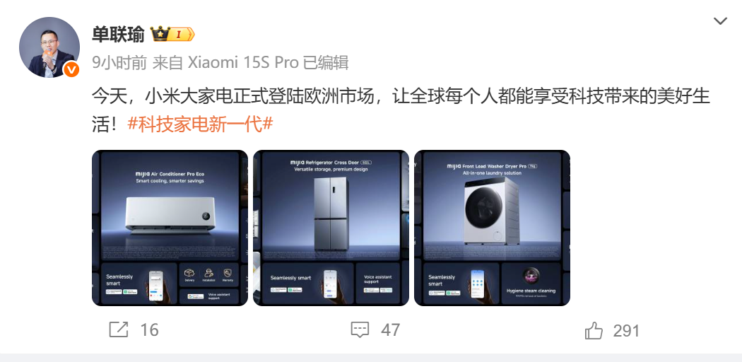 【环球网科技综合报道】9月25日消息,小米集团大家电部总经理单联瑜今日通过其个人微博账号发文宣布,小米大家电当日正式登陆欧洲市场,秉持“让全球每个人都能享受科技带来的美好生活”的理念,为欧洲消费者带来空调、冰箱、洗衣机等大家电产品,进一步丰富当地市场的消费选择。