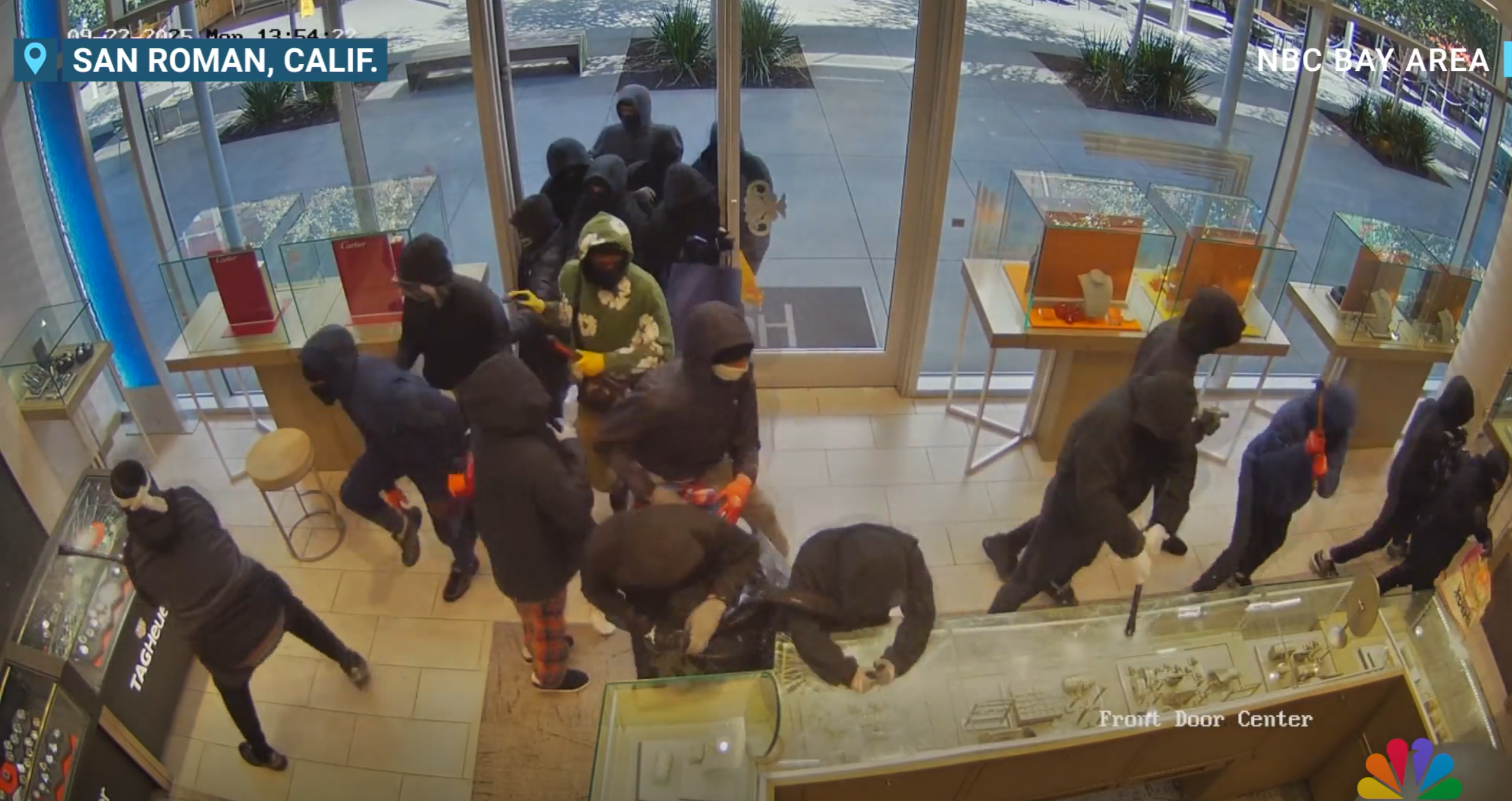 【环球网报道】据美国全国广播公司(NBC)25日报道,美国加利福尼亚州旧金山湾区一家珠宝店当地时间22日下午遭遇打砸抢事件:大约20名蒙面持械暴徒闯入该珠宝店,砸开陈列柜盗取珠宝,部分劫匪携带枪支。