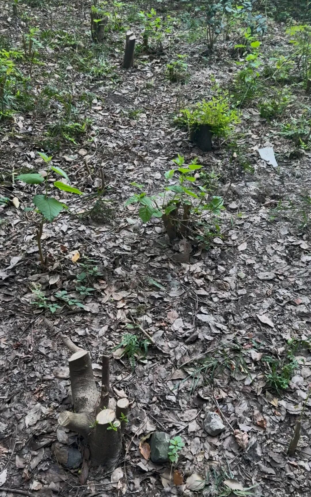 居民周先生和周女士带领记者走访小区被砍的树木,据介绍,位于小区中间区域的中央花坛中,有多棵树木被砍伐。记者在花坛中见到了这些树桩,多棵树木被砍至根部,其中不乏直径超过10cm的大树。在20号楼和21号楼南侧,周女士拨开杂草给记者展示伤痕累累的树桩:“被砍倒的当天还流了很多油脂,现在也看不到了。”