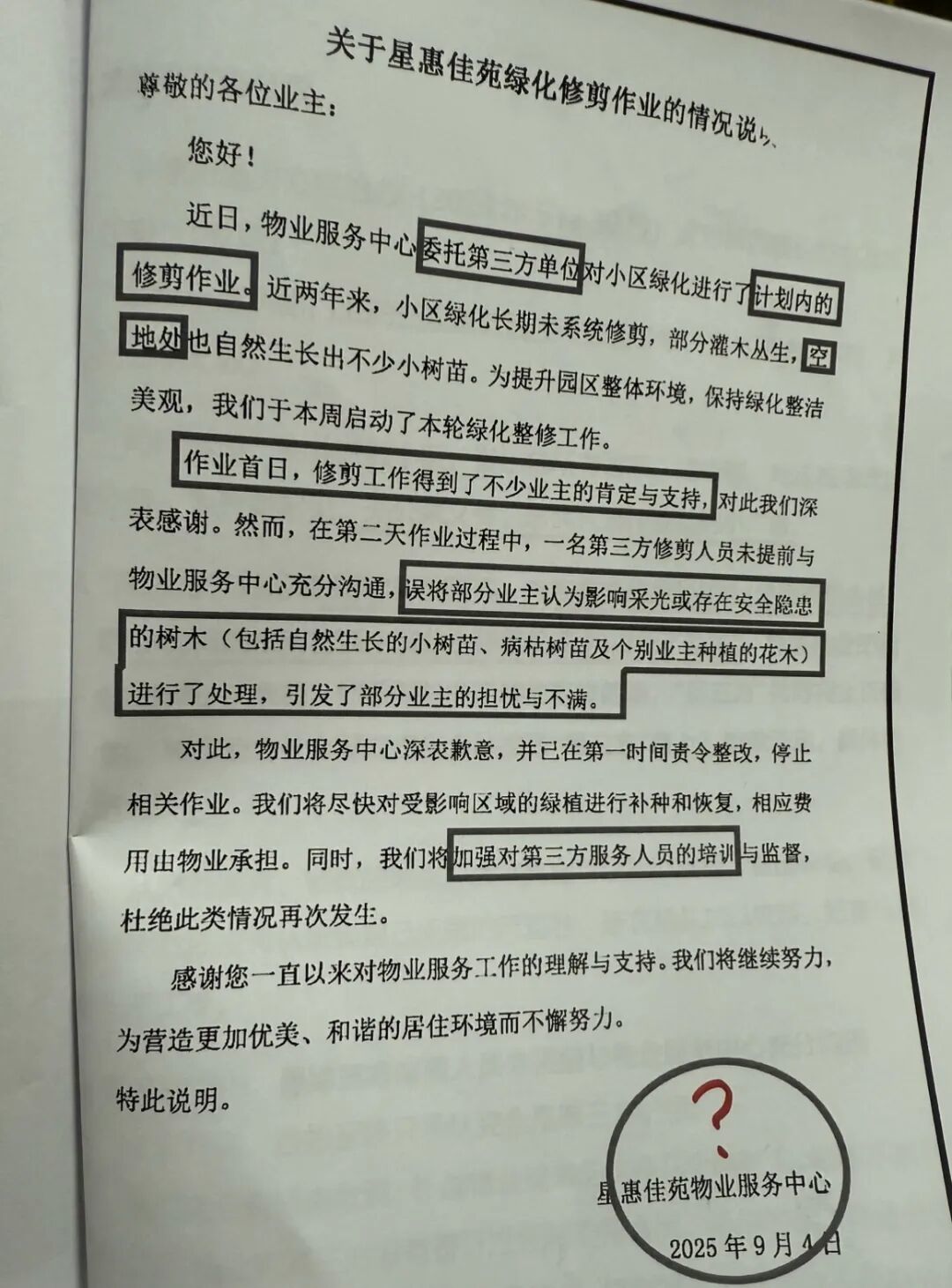记者同时收到了一份据称是物业9月4日张贴的情况说明,说明中提到:“第三方修剪人员误将部分业主认为影响采光或存在安全隐患的树木(包括自然生长的小树苗、病枯树苗以及个别业主种植的花木)进行了处理。”居民们说,说明张贴后不久即被撤走。记者随后在物业经理处确认了“第三方修剪人员违规操作”的说法,但这一说法让大家更为疑惑:如果是为了采光和安全,修剪靠近居民楼的树就可以了,和远离居民楼的中央花坛里的树有什么关系?