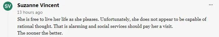 她可以自由地过自己喜欢的生活。但不幸的是,她似乎没有理性思考的能力。这才是令人担忧的,社会服务机构应该去看看她。越快越好。