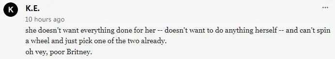 她不想别人给她包办事情,也不想自己动手做,她二选一都定不下来。可怜的布兰妮。