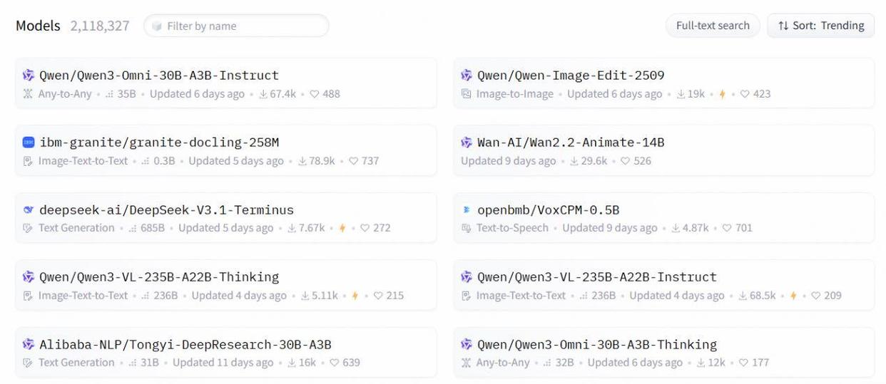 9月28日,全球最大AI开源社区Hugging Face公布了新一期模型榜单,阿里通义7款模型入选全球前十开源模型榜单,几乎实现屠榜,其中刚刚开源的全模态大模型Qwen3-Omni登顶。