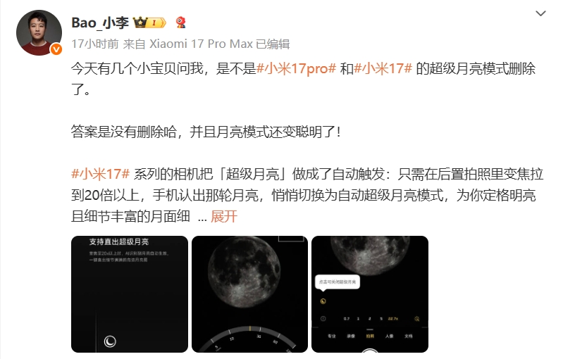 【环球网科技综合报道】9月29日消息,小米相机部产品经理 @Bao_小李 发文回应了“是不是小米 17 Pro 和小米 17 的超级月亮模式删除了”这一问题。他表示,“答案是没有删除哈,并且月亮模式还变聪明了!”