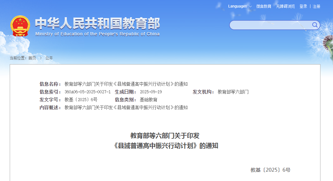 【环球网报道 记者 陈全】记者9月26日从教育部获悉,为贯彻落实全国教育大会精神和《教育强国建设规划纲要(2024—2035年)》部署,加快推动城乡普通高中教育协调发展,促进县中振兴,教育部会同国家发展改革委、财政部、人力资源社会保障部、自然资源部及住房城乡建设部共同制定《县域普通高中振兴行动计划》(以下简称《行动计划》)。