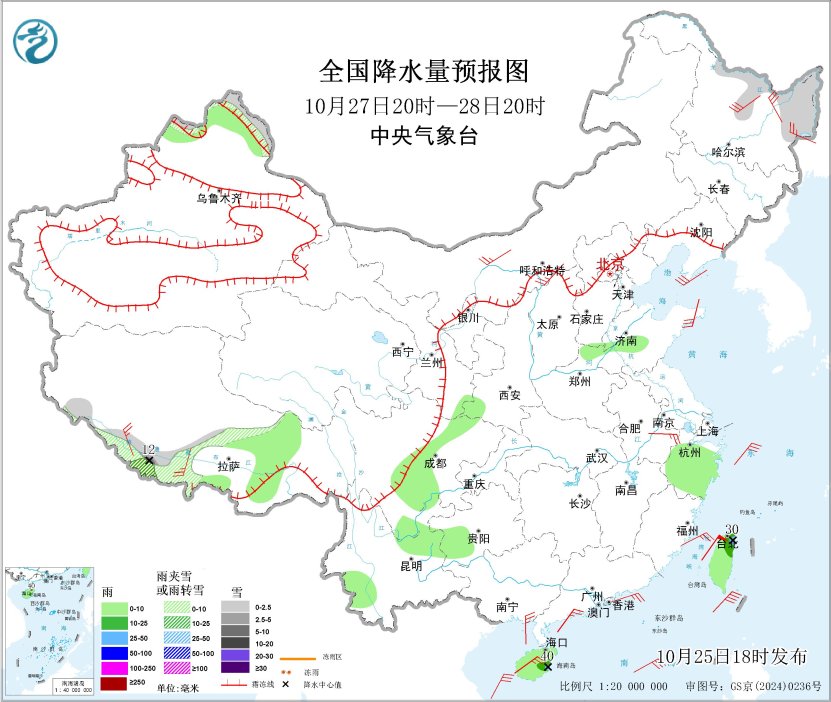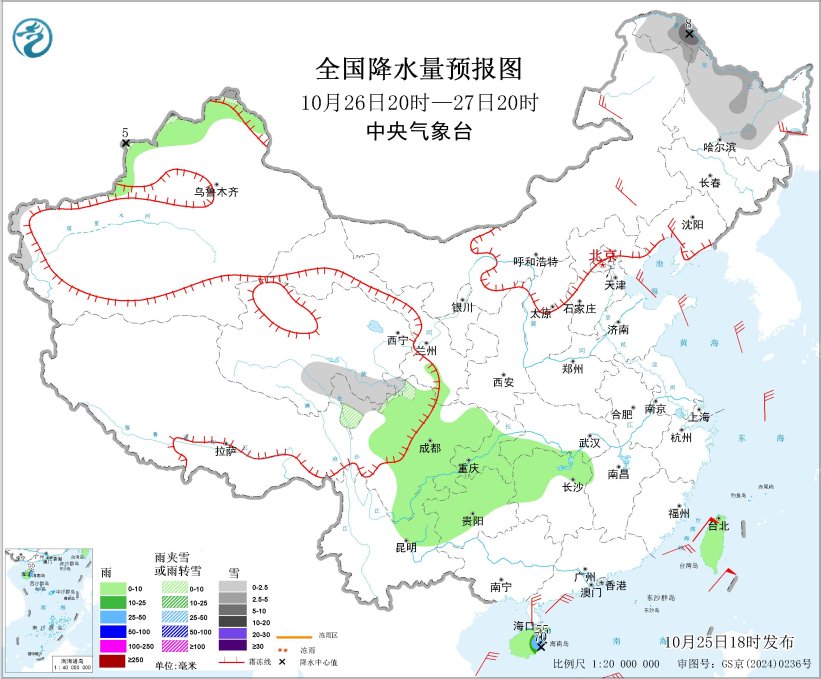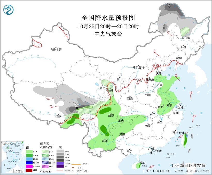 10月25日20时至26日20时,内蒙古东北部、黑龙江中西部、西藏北部、青海南部、甘肃南部、川西高原北部等地部分地区有小到中雪或雨夹雪,其中,西藏东北部、青海东南部等地局地有大到暴雪(10~12毫米)。西藏东南部、山东大部、安徽中部、江苏大部、湖南北部、西南地区大部、台湾岛大部等地部分地区有小到中雨,其中,台湾岛东北部等地局地有大雨(25~45毫米)。内蒙古中东部、辽东半岛、西藏北部、山东半岛等地部分地区有4~6级风。东海南部、台湾海峡、台湾以东洋面、南海西北部海域将有5~7级、阵风8级的偏北到东北风(见图2)。
