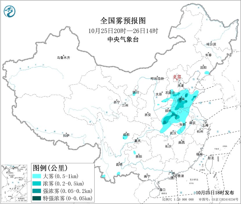 10月25日夜间至26日上午,河北南部、山东大部、河南东部、安徽北部、湖北北部等地有大雾,其中山东西南部、河南东南部等地的部分地区有能见度不足500米的浓雾,局地有能见度不足200米的强浓雾(见图1)。中央气象台10月25日18时发布大雾黄色预警。此外,25日夜间,华北中南部、黄淮中西部等地的部分地区有轻度霾,局地中度霾。26日凌晨起,受冷空气影响,上述地区大气扩散条件逐渐好转。