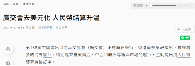 香港文汇报也报导,此次广交会掀起“人民币结算热”,许多企业主动“去美元化”。