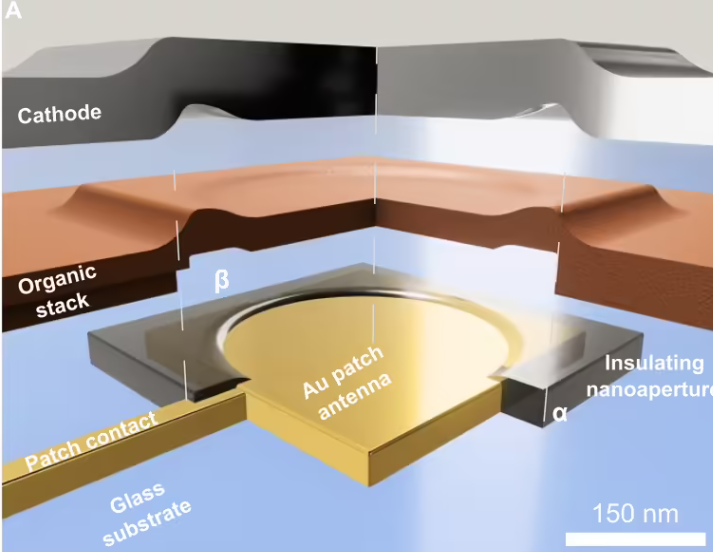 为解决这一关键问题,研究团队进行了结构创新,在新设计中引入一层专门研发的绝缘层,仅在天线中央保留直径200纳米的圆形开口。这一设计能有效阻断边缘和角落的电流注入,确保电流均匀分布,从而实现纳米发光二极管的稳定、持久运行。“在这一优化结构下,我们研制的首批纳米像素在常温环境中已能稳定工作长达两周。”赫希特教授介绍说。