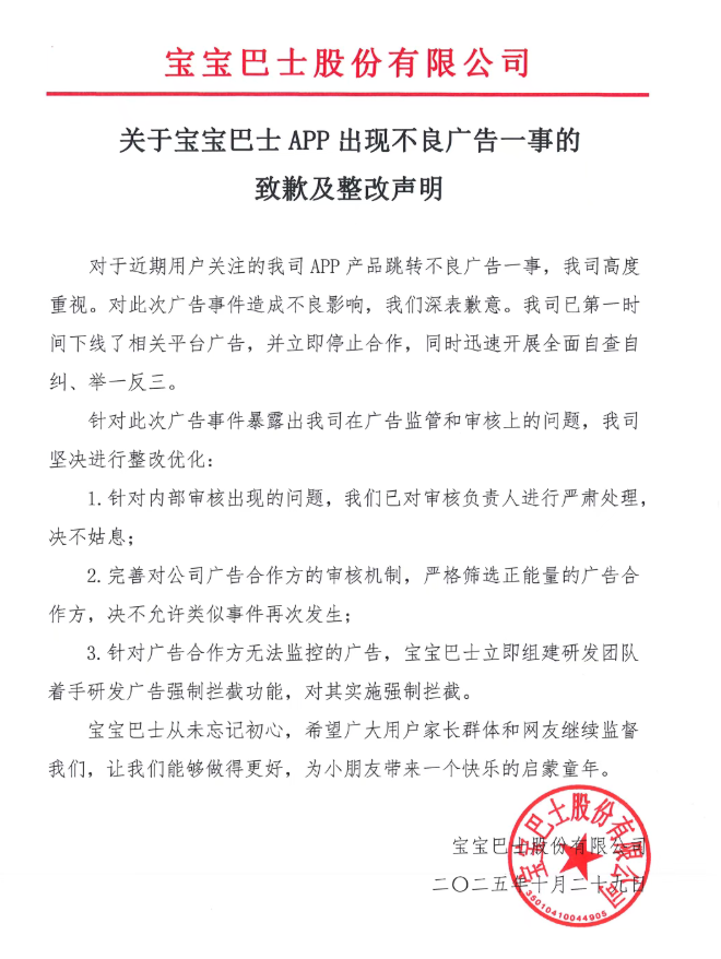 10月29日上午,宝宝巴士相关负责人就此事道歉,并称,“出现在APP上的问题广告是第三方平台接入广告。由于在广告审核和监管环节存在疏漏,导致此类不适合儿童观看的广告出现在了应用开屏页面。”