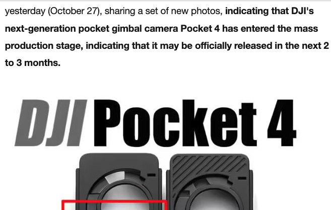 【环球网科技综合报道】10月29日消息,外媒inf.news发布博文分享了一组新照片,揭示大疆下一代口袋云台相机Pocket 4已进入量产阶段,该产品极有可能在未来2至3个月内正式与消费者见面。