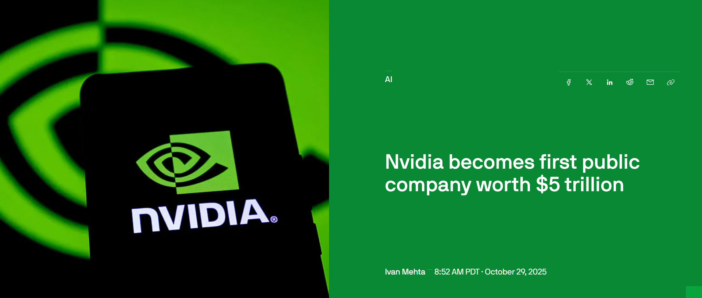 【环球网科技综合报道】10月30日消息,据科技媒体TechCrunch报道,当地时间周三,美国股市开盘后,英伟达公司股价表现强劲,开盘即暴涨3.2%,公司市值成功站上5万亿美元关口,成为全球资本市场史上首家市值突破这一里程碑的上市公司。盘中,英伟达股价最高涨幅进一步扩大至5%以上,对应市值一度超过5.13万亿美元,创下全球企业市值新纪录。