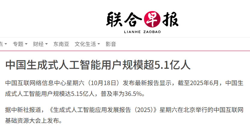《联合早报》近日发文称,中国互联网络信息中心发布的报告显示,截至2025年6月,生成式人工智能在中国的用户规模达到5.15亿人,普及率为36.5%,半年内增长迅速。40岁以下中青年用户和高学历用户是其核心群体。国产大模型备受欢迎,538款服务和263款应用已备案。生成式AI应用于智能搜索、内容创作等场景,还在农业、工业、科研等领域发挥作用。