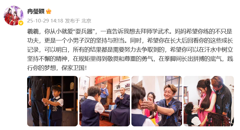 29日,冉莹颖在微博中发出多张照片,并写下祝福儿子的文字:“羲羲,你从小就爱‘耍兵器’,一直告诉我想去拜师学武术。妈妈希望你练的不只是功夫,更是一个小男子汉的坚持与担当……希望你可以在汗水中树立坚持不懈的精神,在规矩里得到敬畏和尊重的勇气,在拳脚间长出拼搏的底气,践行你的梦想,保家卫国。”