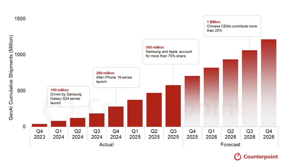 【环球网科技综合报道】11月1日消息,市场研究机构 CounterPoint Research最新报告称,2025 年第 3 季度,全球生成式 AI 手机在不到 2 年时间内,累计出货量已突破 5 亿部。