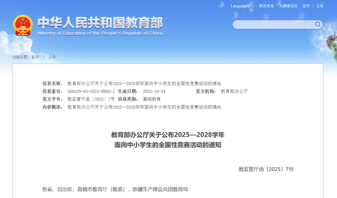 【环球网报道 记者 陈全 实习生 聂希子】记者近日从教育部了解到,根据《教育部办公厅等四部门关于印发〈面向中小学生的全国性竞赛活动管理办法〉的通知》精神,由主办单位自主申报,经组织专家进行评审、公示和复核等程序,确定全国青少年人工智能创新挑战赛等47项竞赛活动为2025-2028学年面向中小学生的全国性竞赛活动,举办时间原则上为2025年10月至2028年8月,在此期间每学年举办不得超过1次,累计不超过3次。
