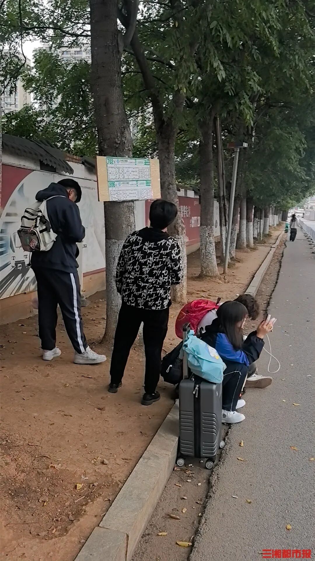 市民在临时站点等车,为方便大家找上车点,李平安自制了公交站牌。罗艾敏 摄