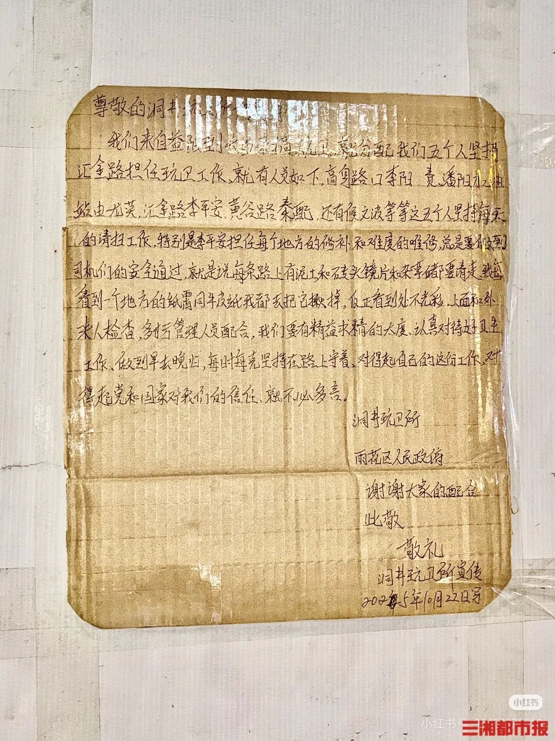 信是他10月22日写的。这个来自益阳的环卫工人,把对工作的认真一笔一画地写在纸壳上:“所里五人坚持每天的清扫工作……总要做到让司机们安全通过,我看见路上有泥土、砖头、镜片和杂草都要清走,有地方有纸屑我都去把他揪掉……”