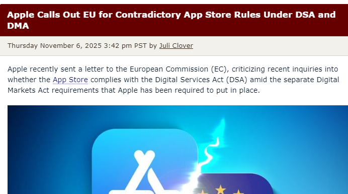 【环球网科技综合报道】11月7日消息,据外媒macrumors报道,苹果公司致信欧盟委员会,直指《数字服务法》(DSA)与《数字市场法》(DMA)存在规则冲突,批评欧盟一边要求 App Store强化消费者保护,一边强制推行削弱安全保障的侧载等功能,此举“不合逻辑”。
