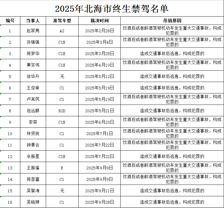 《北海市2025年“终生禁驾”名单》