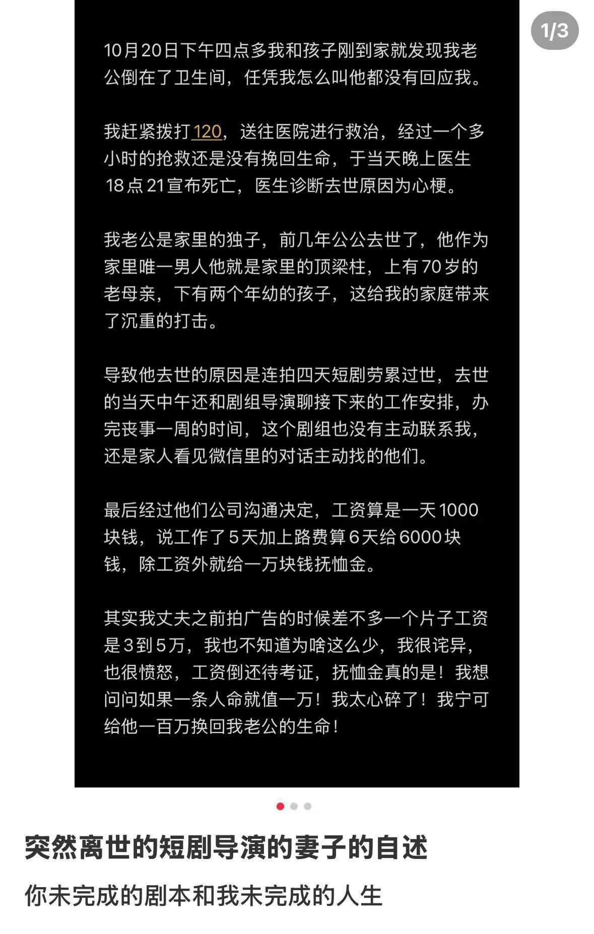 近日,一篇题为《你未完成的剧本和我未完成的人生》的帖子引发网友关注。该篇网帖中,博主称自己从事短剧导演的丈夫不幸因心梗离世。11月7日晚,博主王女士告诉极目新闻记者,10月中旬,她的丈夫高先生在结束拍摄工作返家后第三天突然离世,当天中午他依然在处理工作事务。