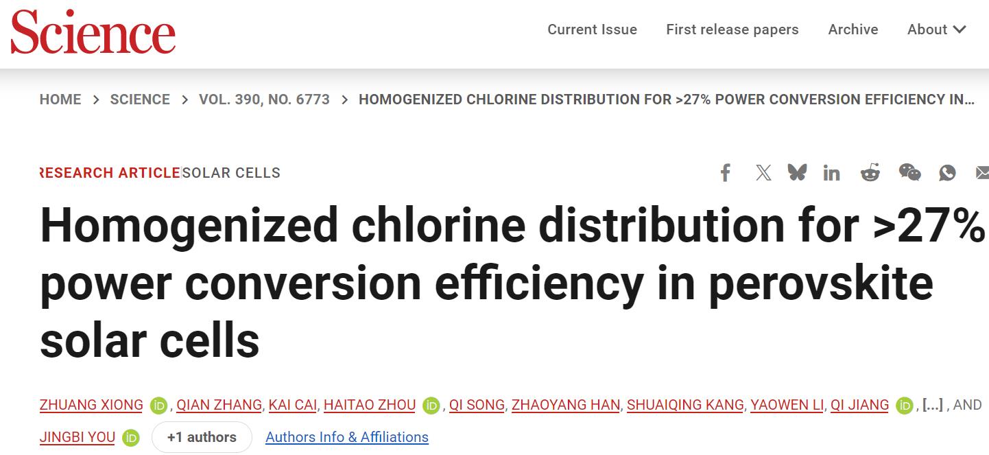 据悉,相关研究成果以“Homogenized chlorine distribution for >27% power conversion efficiency in perovskite solar cells”为题,发表在《科学》(Science)上。