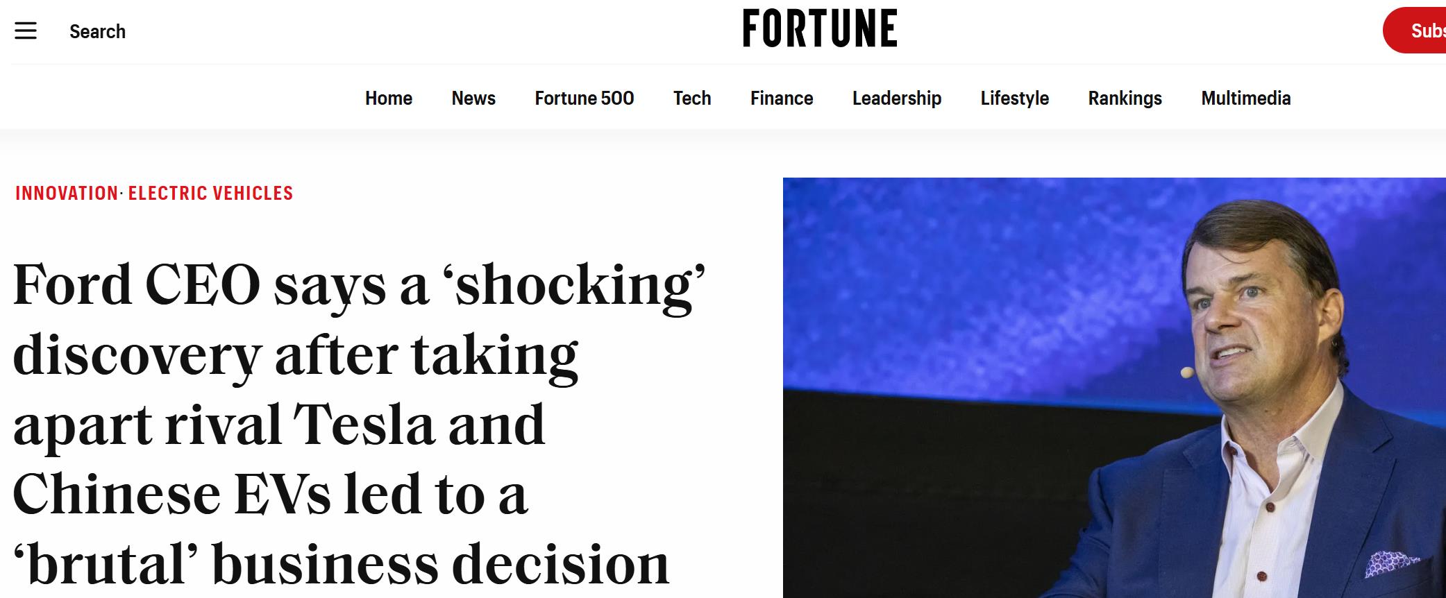 法利表示,按照行业惯例,福特工程团队对特斯拉和中国同级车型进行系统拆解。“当我们摊开线束图,Mustang Mach-E 比 Model 3 多近一英里导线,重量、成本、故障点同步增加。当拆解中国竞争对手的车辆时,发现的结果同样令人惊讶。 ”