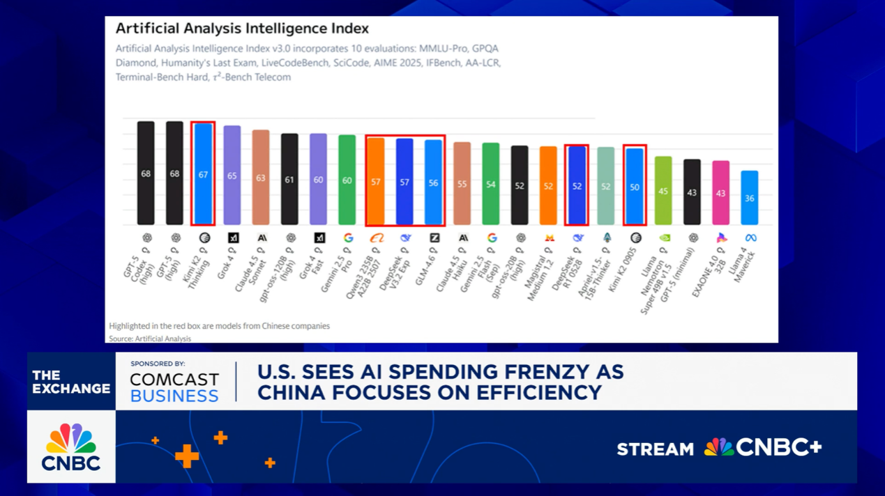 报道指出,美国 AI通常通过信贷和融资来建设大规模数据中心,而中国AI公司不仅使用更便宜的芯片,而且由于投资额存在巨大差距,还以更低的成本搭建精简型基础设施。高盛上周末发布的一份报告中引用了Artificial Analysis最新榜单,数据显示,Kimi K2 Thinking模型在智能指数中以67分排名第3,仅次于GPT5,同时Qwen、DeepSeek这样的中国模型也在该基准测试中与美国顶级模型并驾齐驱。