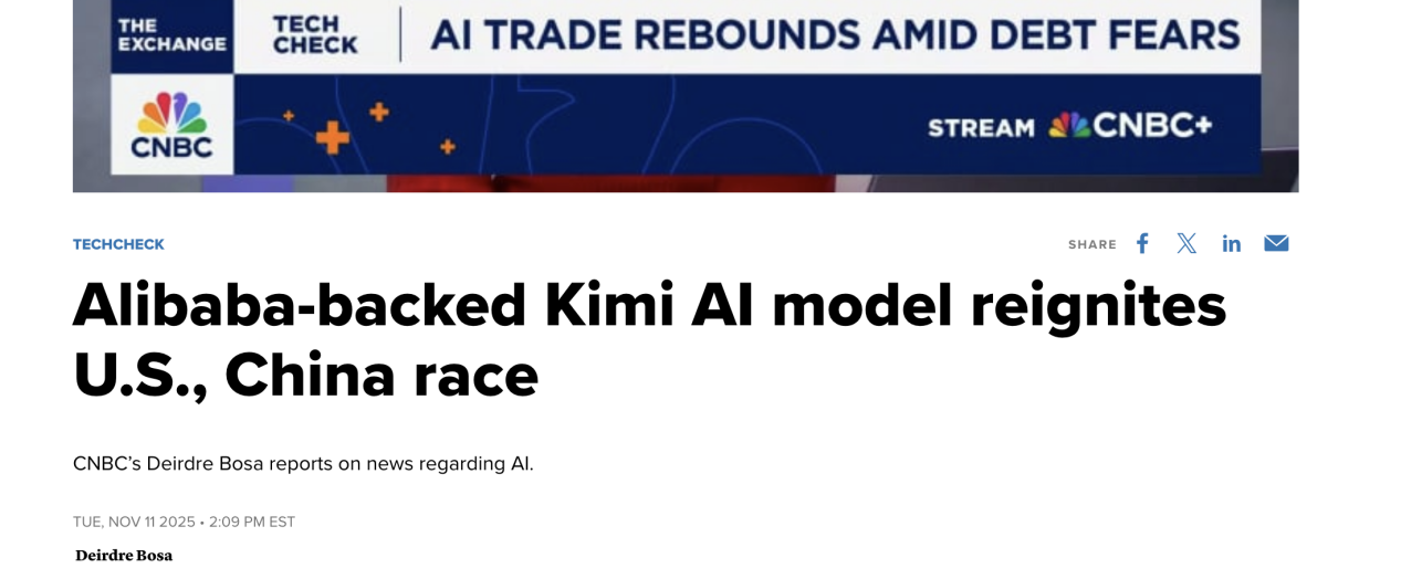 【环球网科技综合报道】11月12日消息,据美国消费者新闻与商业频道(CNBC)报道,中美 AI 竞赛呈现日益增长的巨大反差。来自中国初创公司月之暗面发布的最新开源模型 Kimi K2 Thinking 在多项标准基准测试中表现出色,而其训练成本不到 500 万美元。这意味着美国的 AI 繁荣是建立在“借钱”之上,而中国更注重成本和效率。