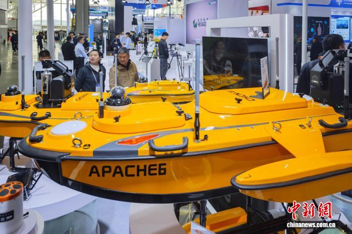 12月4日,以“融创新·拓边界·共绘地理信息新篇章”为主题的中国测绘地理信息技术装备展览会在南京国际展览中心开幕,汇聚全产业链力量,设立智能装备与高端传感器、实景三维与数字孪生技术、地理信息安全与自主可控、空天地海一体化监测、地理信息+行业应用解决方案五大展区,集中展示前沿技术、拓展应用边界、深化国际合作,为产业高质量发展注入新动能。图为观众在展厅内参观展出的无人船。中新社记者 泱波 摄