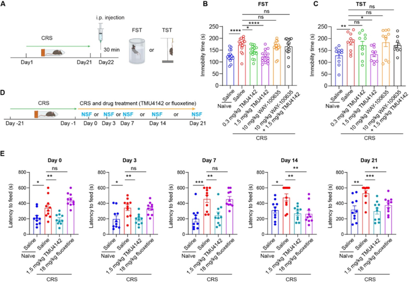 TMU4142在小鼠抑郁模型上表现出快速抗抑郁效果。大健康研究院供图