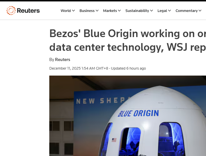 【环球网科技综合报道】12月11日,华尔街日报援引知情人士消息称,贝索斯旗下航天公司蓝色起源(Blue Origin)已投入超一年时间,研发太空人工智能数据中心所需核心技术。无独有偶,马斯克的SpaceX也正推进相关布局,计划用升级版星链卫星搭载AI计算载荷,该技术更成为其股权出售的宣传亮点,若达成协议,SpaceX估值或达8000亿美元。两大航天力量正围绕太空数据中心展开角力。