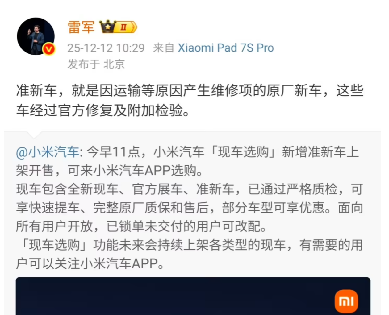 针对“准新车”的定义与来源,小米官方作出明确说明:此类车型本质为原厂新车,仅因运输等特殊原因产生过维修需求,且已完成官方专业修复及额外的售前检验流程,确保车辆品质达标。小米创办人、董事长兼CEO雷军也在个人社交平台评论区回应称,“准新车不是我们发明的,我们只是沿用了同行的名字”,厘清了该概念的行业通用性。