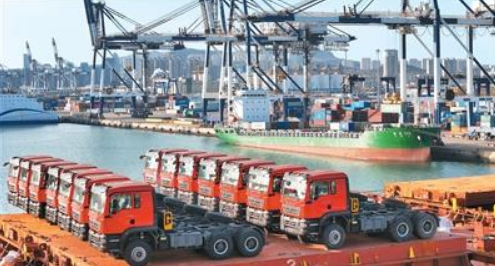 国产卡车在山东港口烟台港装船出口。唐克摄(人民视觉)