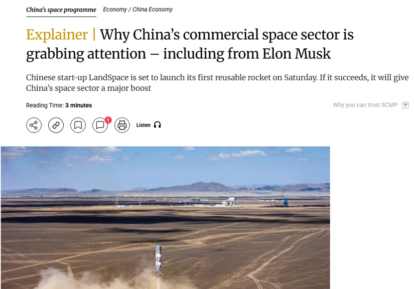 《南华早报》此前发文称,尽管可重复使用火箭技术由美国SpaceX公司引领,但中国掌握这一技术的前景吸引了航天专家的广泛关注,甚至在上个月也引起了SpaceX CEO埃隆·马斯克的评价。10月底,马斯克在社交媒体上评论中国多款可重复使用火箭,他表示,中国公司为“Falcon 9架构”,这些设计有潜力“超越Falcon 9”。