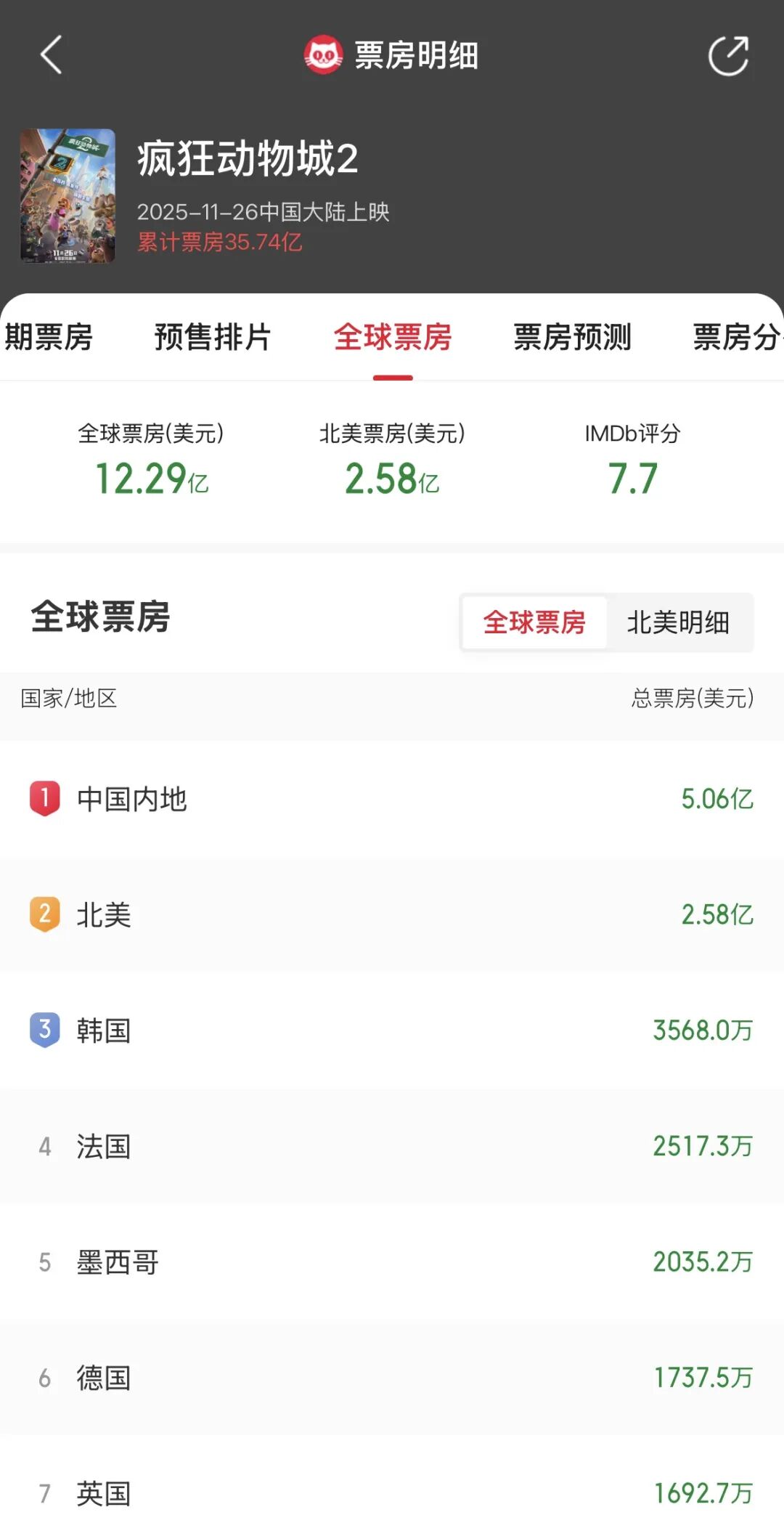 根据猫眼专业版数据,截至12月16日9时,《疯狂动物城2》中国票房已达35.74亿元人民币,全球票房突破12亿美元,成为好莱坞今年第二部全球票房超10亿美元的影片。