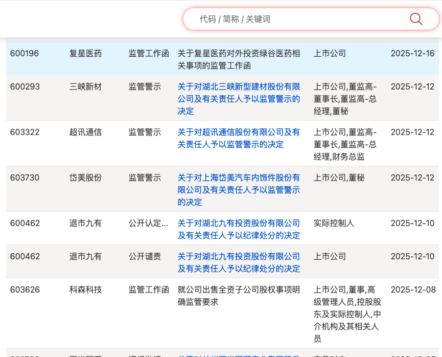 12月16日,上交所就复星医药对外投资绿谷(上海)医药科技有限公司(以下简称“绿谷医药”)相关事项下发监管工作函。处理事由是关于复星医药对外投资绿谷医药相关事项,涉及对象是上市公司。此次监管工作函的具体内容并未披露。