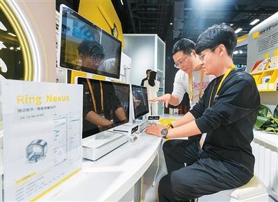 近年来,中国互联网产业发展迅速。图为第八届进博会医疗器械及医药保健展区的美团医药健康展台,参观者体验AI中医四诊合参仪。 翁奇羽摄(人民视觉)